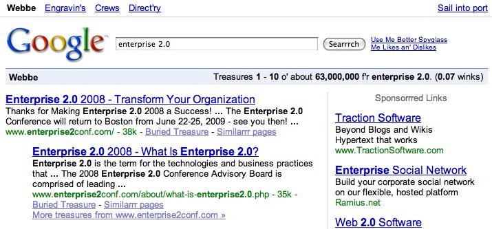 If thou art puzzled by why I be Speaking like This, know ye that Sep 19 be International Talk Like a Pirate Day. Google hath also announced that ye may now choose pirate (as well as Bork Bork Bork or Elmer Fudd) for thy search interface. This as Rumored by Douglas Cornelius, the most Fearsome Lawyer of Boston on this day.